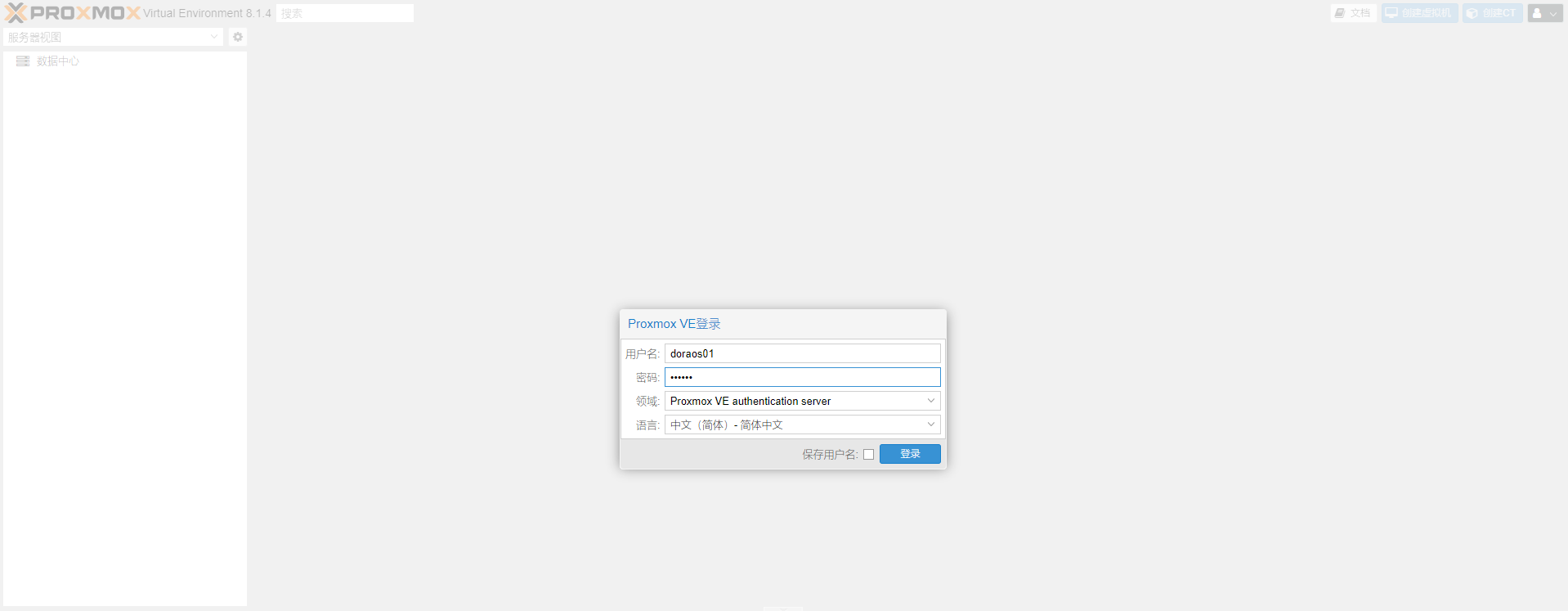 1.登录链接,选择“Proxmox VE authentication server”,选择“简体中文”,输入账号和密码,点击登录